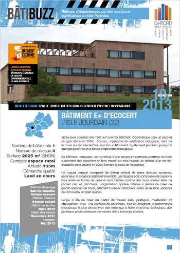Fiche BâtiBuzz de retour d’expérience sur un bâtiment pionner en Midi-Pyrénées : la construction de bureaux isolés en paille et à énergie positive pour le siège social d’Ecocert.