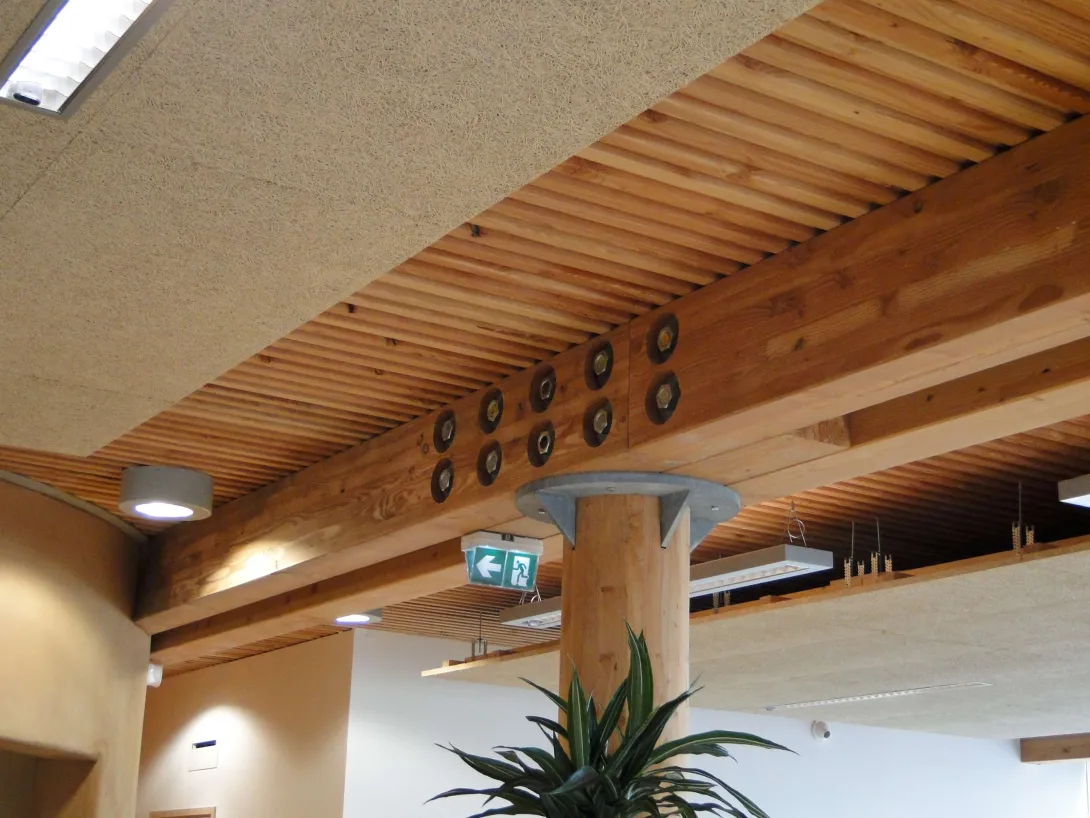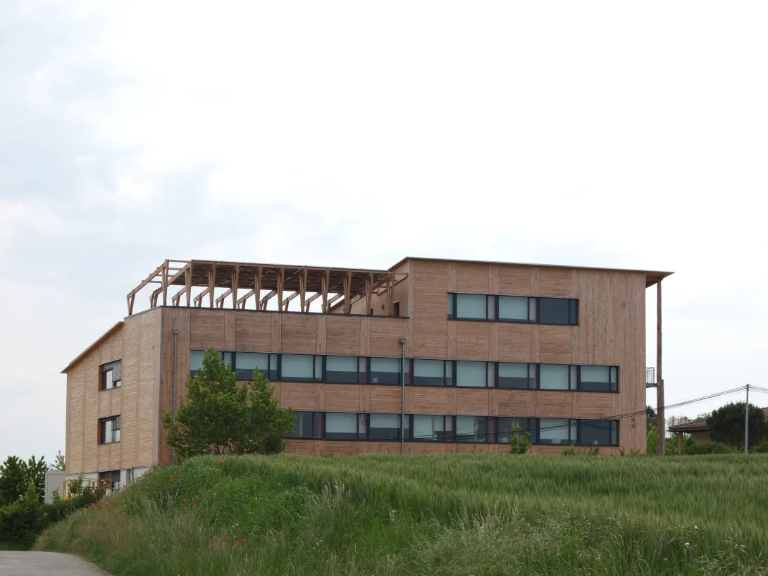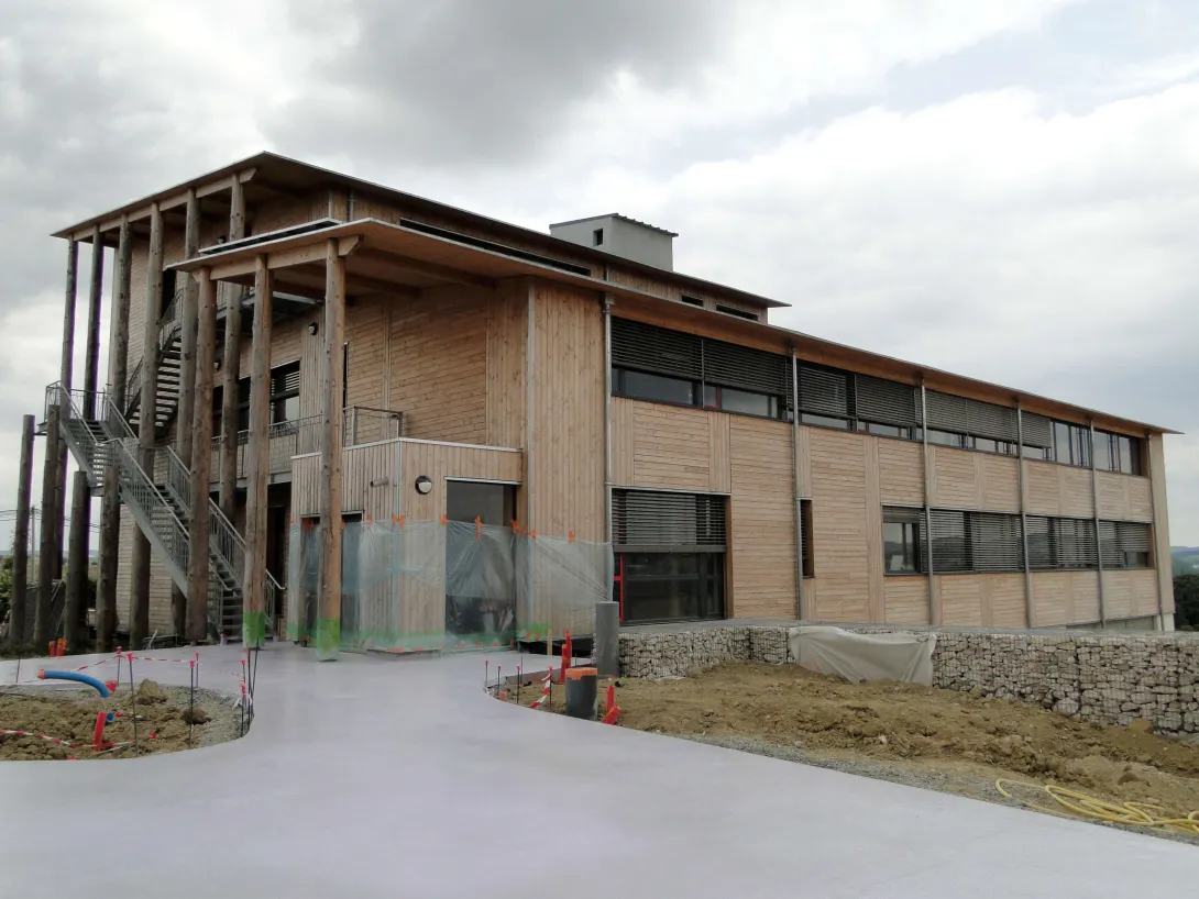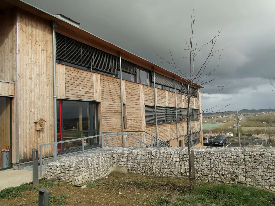 Ce bâtiment, compact, est constitué d’une structure poteaux-poutres en bois supportant des planchers en bois massif sur trois niveaux au-dessus d’un rez-de chaussée semi enterré en béton formant le socle de l’ensemble.