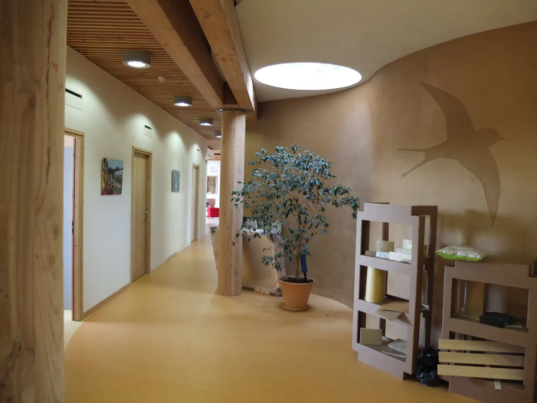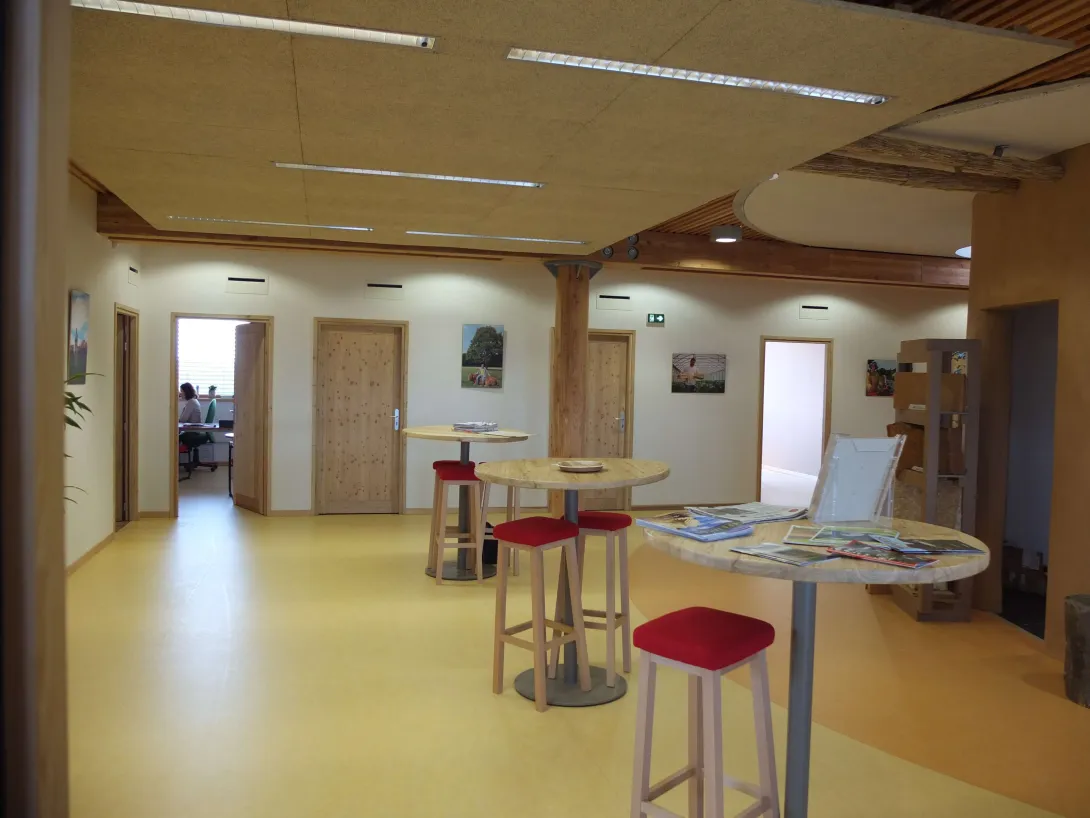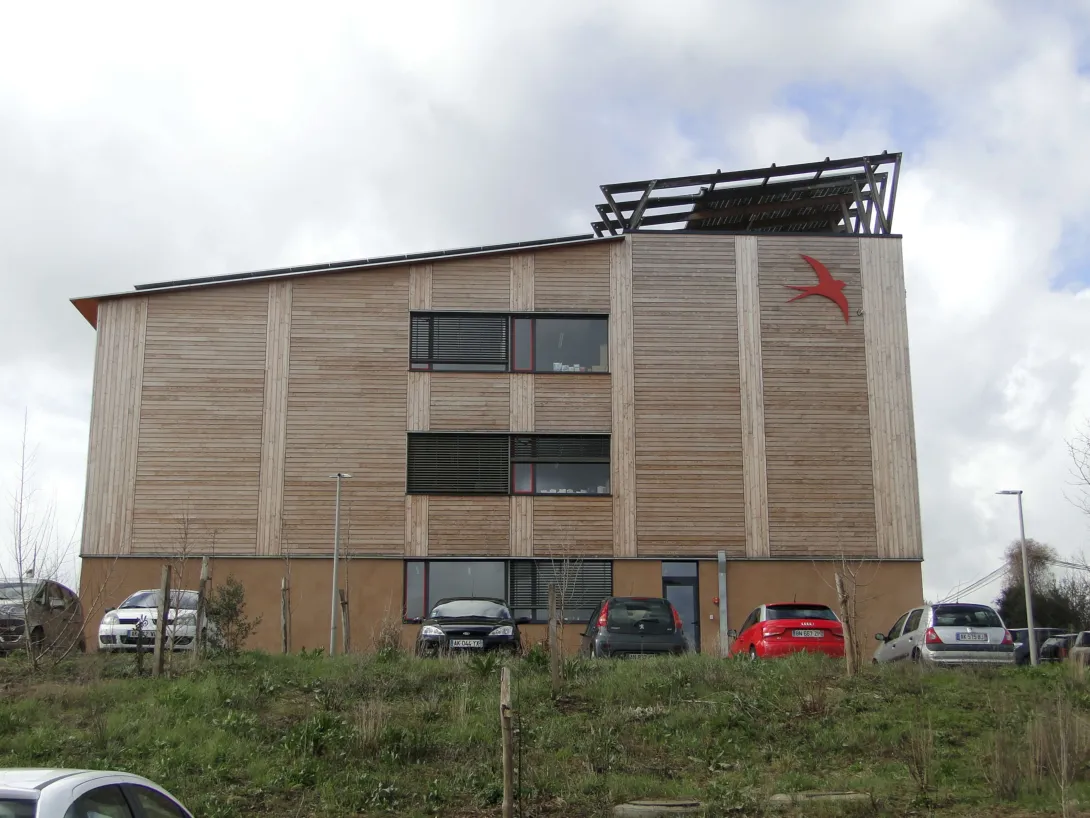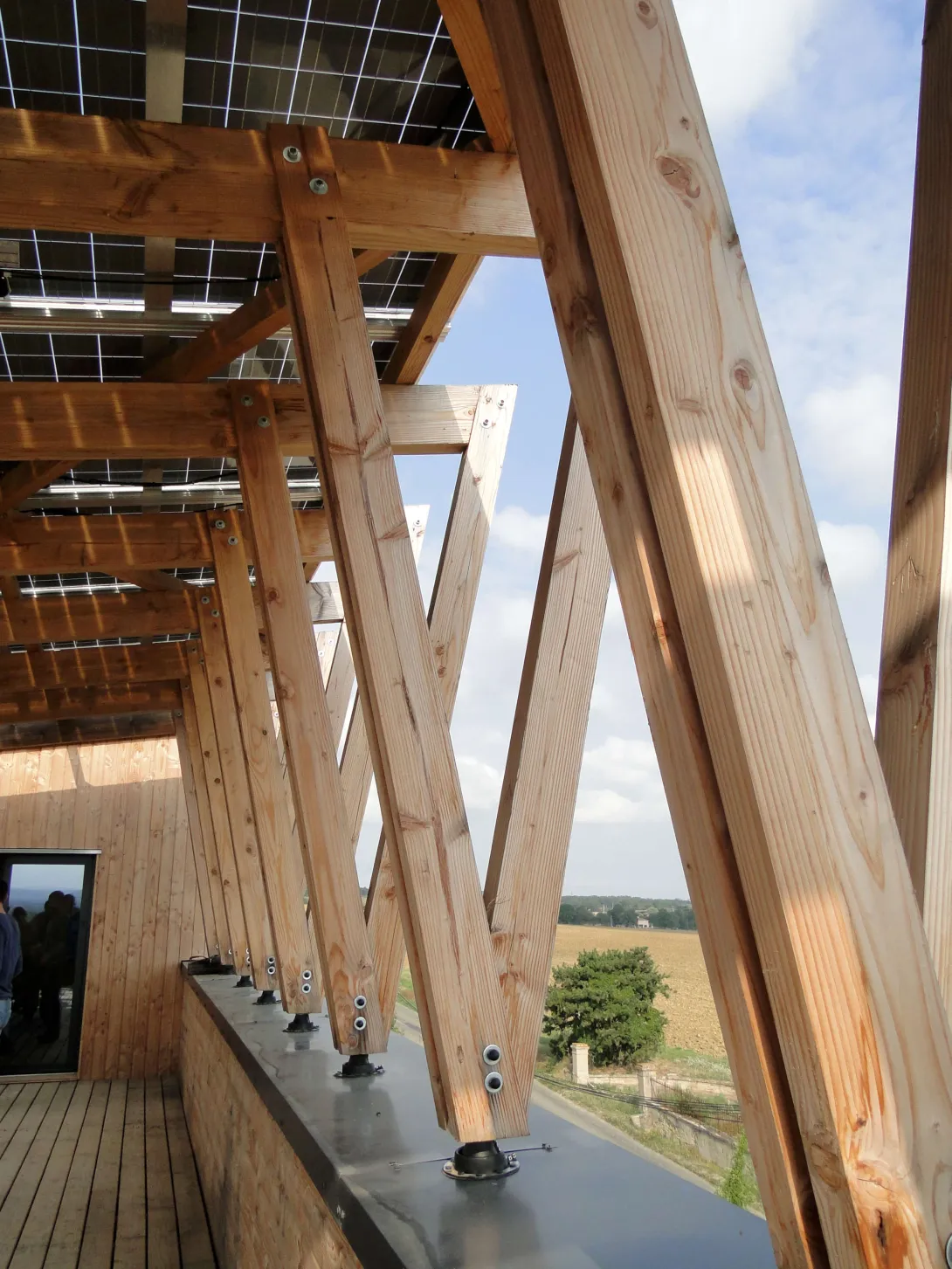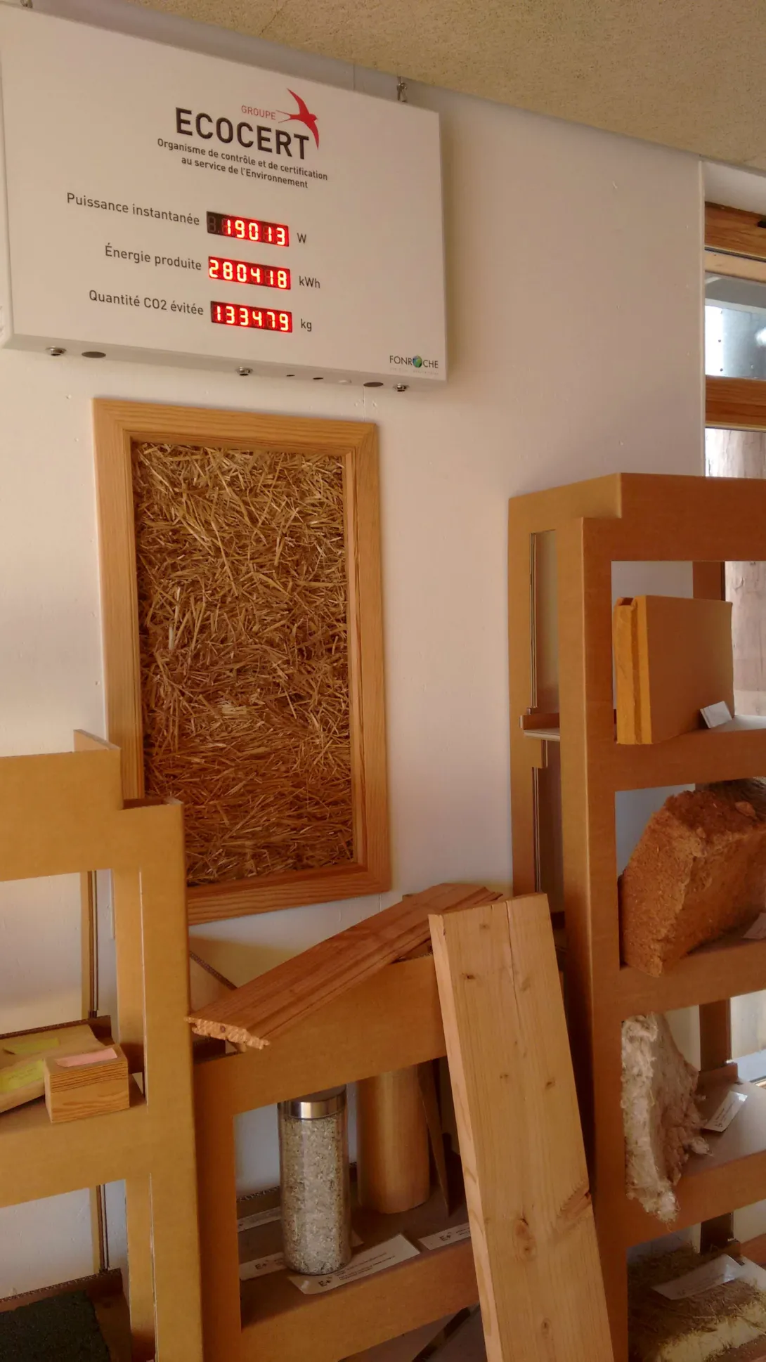 Un noyau central composé de béton enduit de terre (abritant sanitaires, ascenseur et escaliers) stabilise l’ensemble. Les façades sont composées de caissons bois isolés en bottes de paille et sont traitées comme des murs rideaux (elles ne portent pas les planchers). L’organisation spatiale retenue a permis de créer de grands espaces de travail, alternant bureaux individuels, salles de réunion, espaces de convivialité, et open spaces. L’enjeu a été de créer un cadre de travail sain, pratique, modulable et chaleureux pour une centaine de personnes, tout en atteignant la performance énergétique la plus élevée avec des matériaux à faible empreinte écologique, des panneaux photovoltaïques permettant d’être à énergie positive.