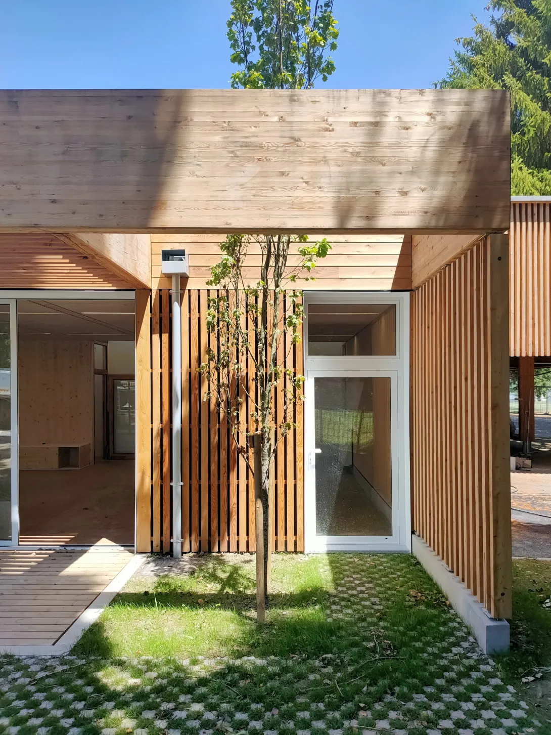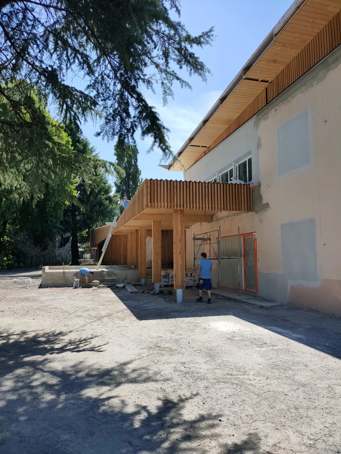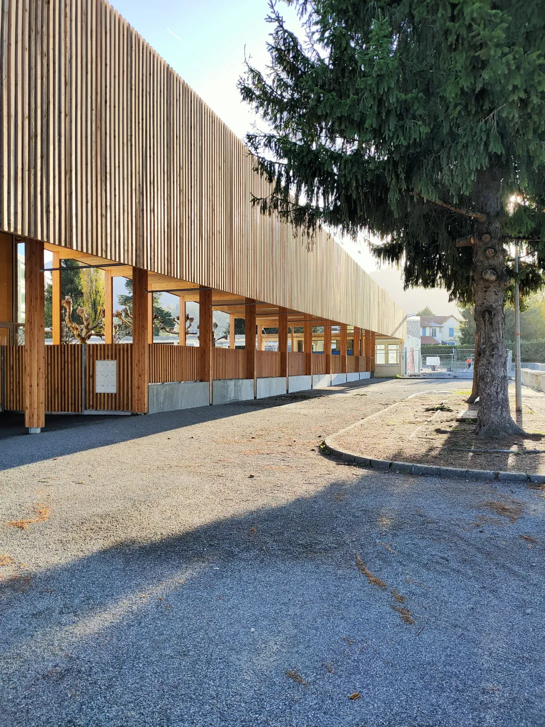 Un restaurant et un préau, construits en bois pour optimiser la durée et les nuisances des travaux réalisés en site occupé, viennent relier le bâtiment de plain-pied de l’école maternelle et celui en R+1 de l’école élémentaire.