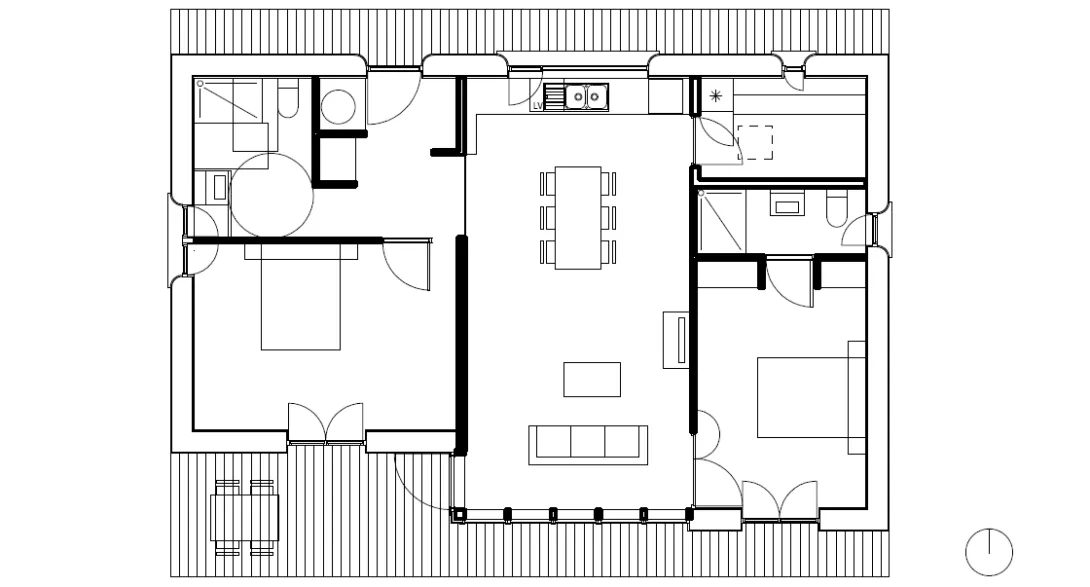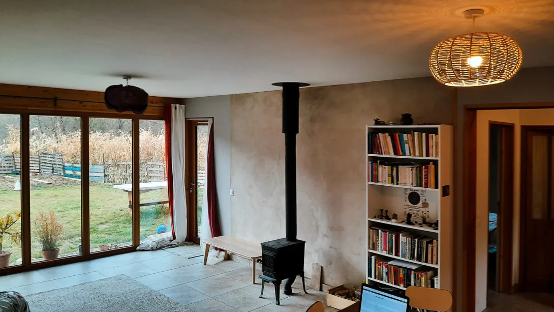 Divers équipements complètent la conception : un poêle à bois pour le confort thermique, un capteur solaire pour l’eau chaude sanitaire et des cuves de récupération pour les eaux pluviales.