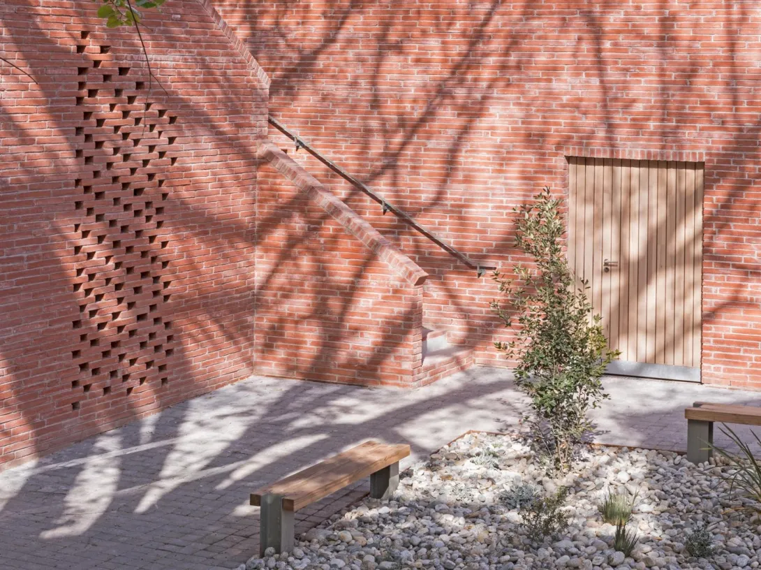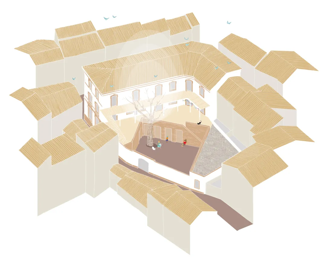 Des ressources locales et/ou biosourcées ont été utilisées dans le respect de l’architecture et de la physique du bâtiment existant, le tilleul de la cour a été préservé et la cour - réouverte au public - a retrouvé de la perméabilité.