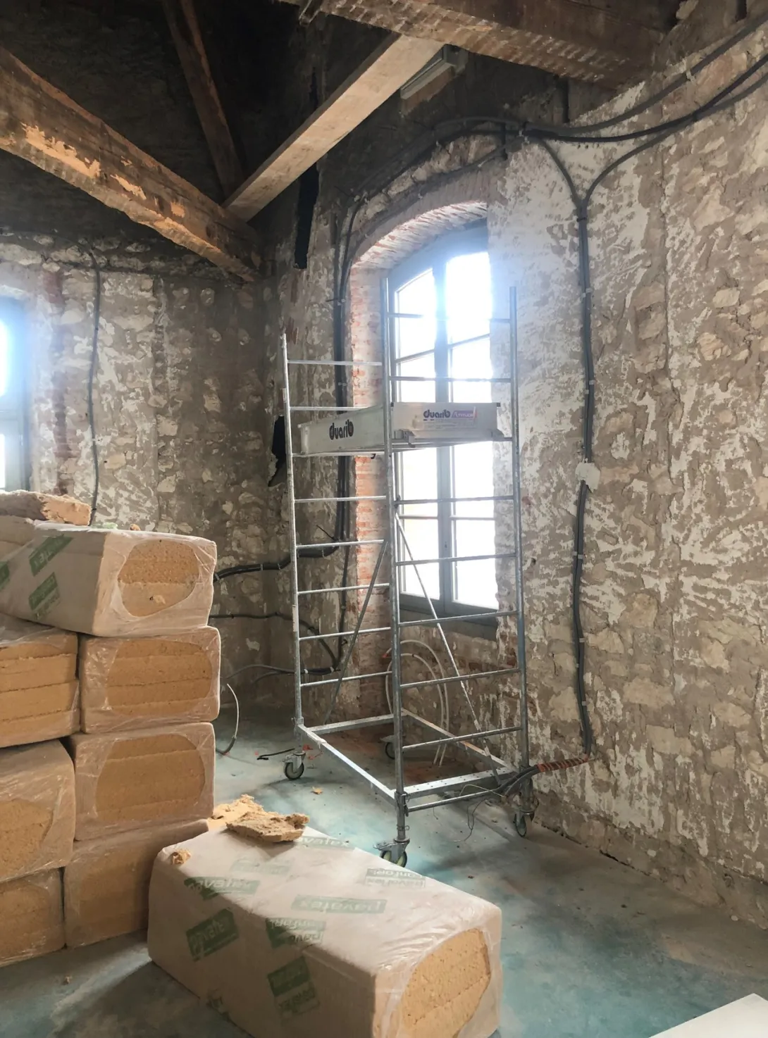 • Isolation thermique par l’intérieur : frein vapeur / fibre de bois 12 cm / mur béton 20 cm (R = 3,71 m².K/W)
