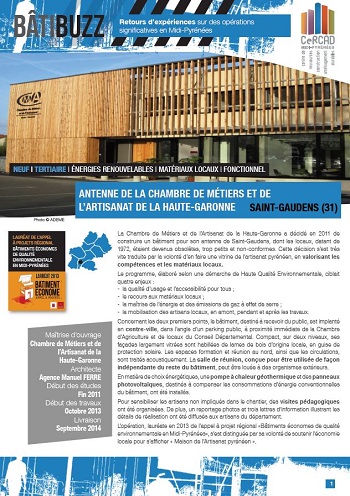 Retour d’expérience sur la construction de la nouvelle antenne de la Chambre de Métiers et de l’Artisanat de la Haute-Garonne à Saint-Gaudens. Cette opération, lauréate de l’appel à projet « Bâtiments économes de qualité environnementale » de la région Midi-Pyrénées en 2013, a fait l’objet d’une analyse multicritère en décembre 2015 dans le cadre du dispositif BâtiBuzz.