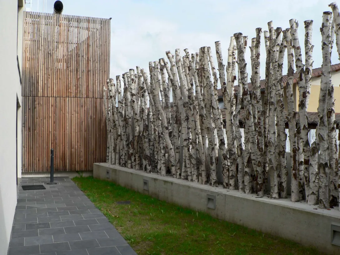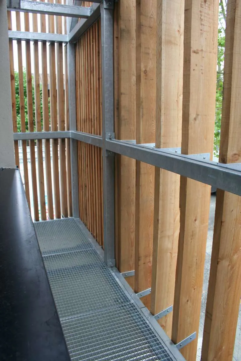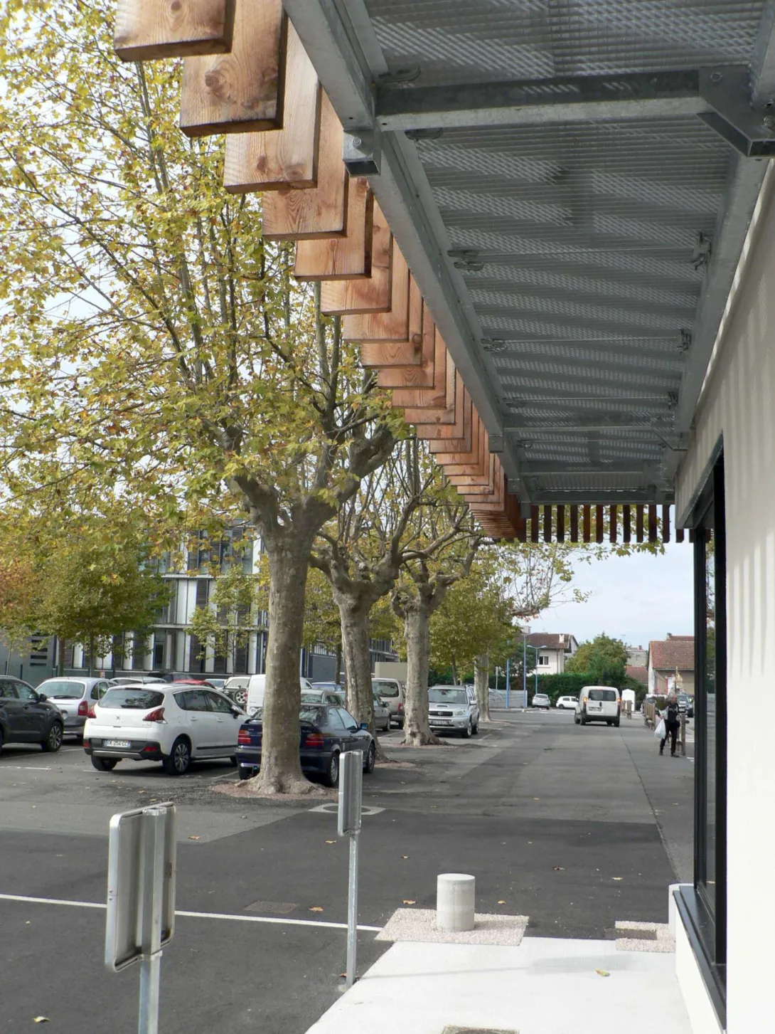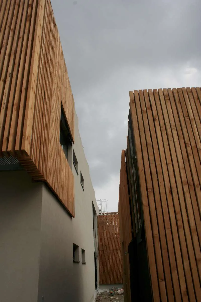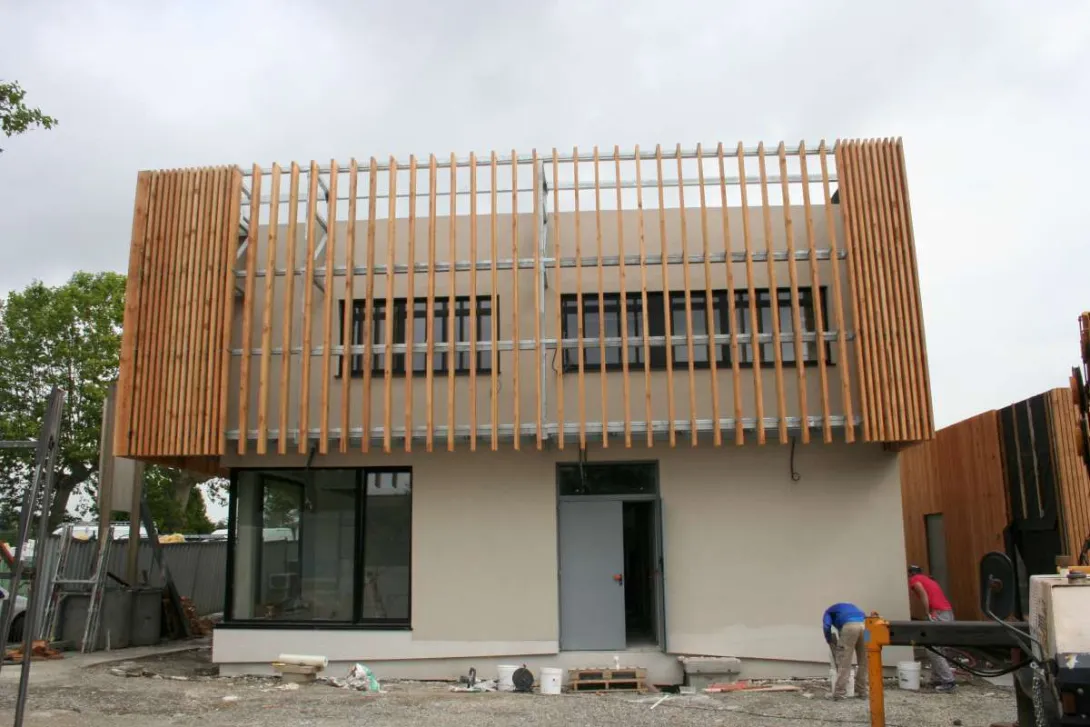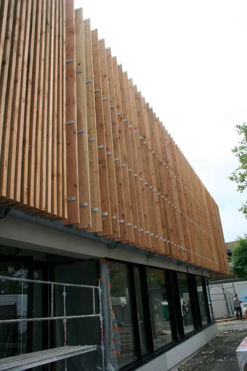 — Soubassements isolés par 12 cm de polystyrène expansé. - Bardage bois sur ossature métallique déportée des façades sud et ouest (R+1) : lames verticales en mélèze brut des Pyrénées plus ou moins resserrées (double fonction brise-soleil et esthétique).