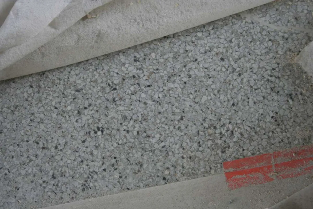 - Terrazzo sur sol du hall d’accueil et circulations du RDC : revêtement à base de marbre et de ciment, coloré et poncé, choisi pour mettre en oeuvre un produit et un savoir-faire local.