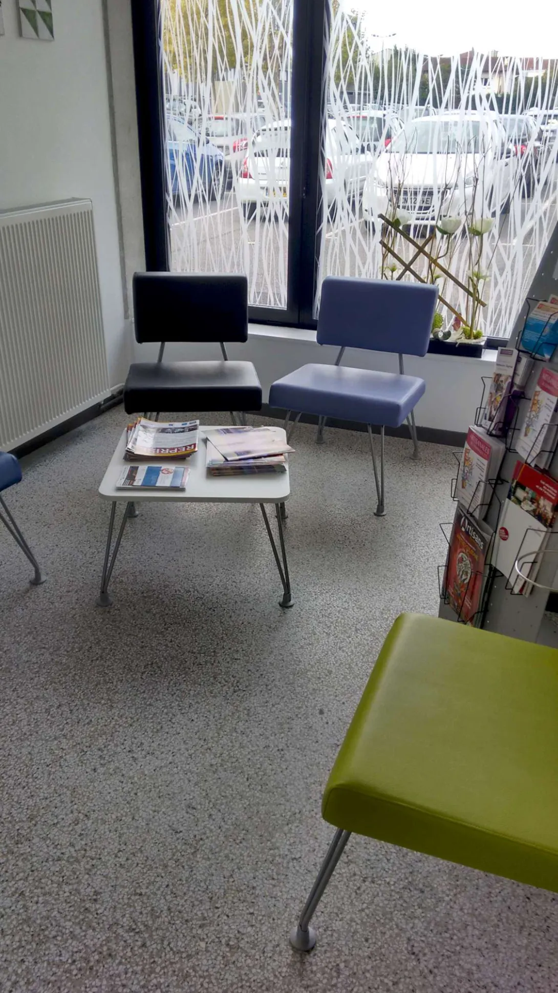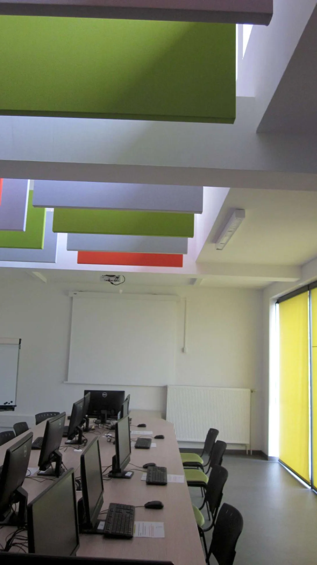 - Habillage en bois ajouré salle de réunion RDC, et baffles acoustiques suspendus dans salle de formation à l’étage.