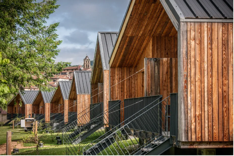 Au moment de rénover son village-vacances, la commune de La Bastide-de-Sérou a privilégié une architecture respectant l’esprit des chalets en bois existants et apte à vieillir harmonieusement. Elle a fait le choix du bois local : avec le soutien du Parc naturel régional des Pyrénées Ariégeoises, les entreprises du bois ont structuré leur réponse pour ce chantier.