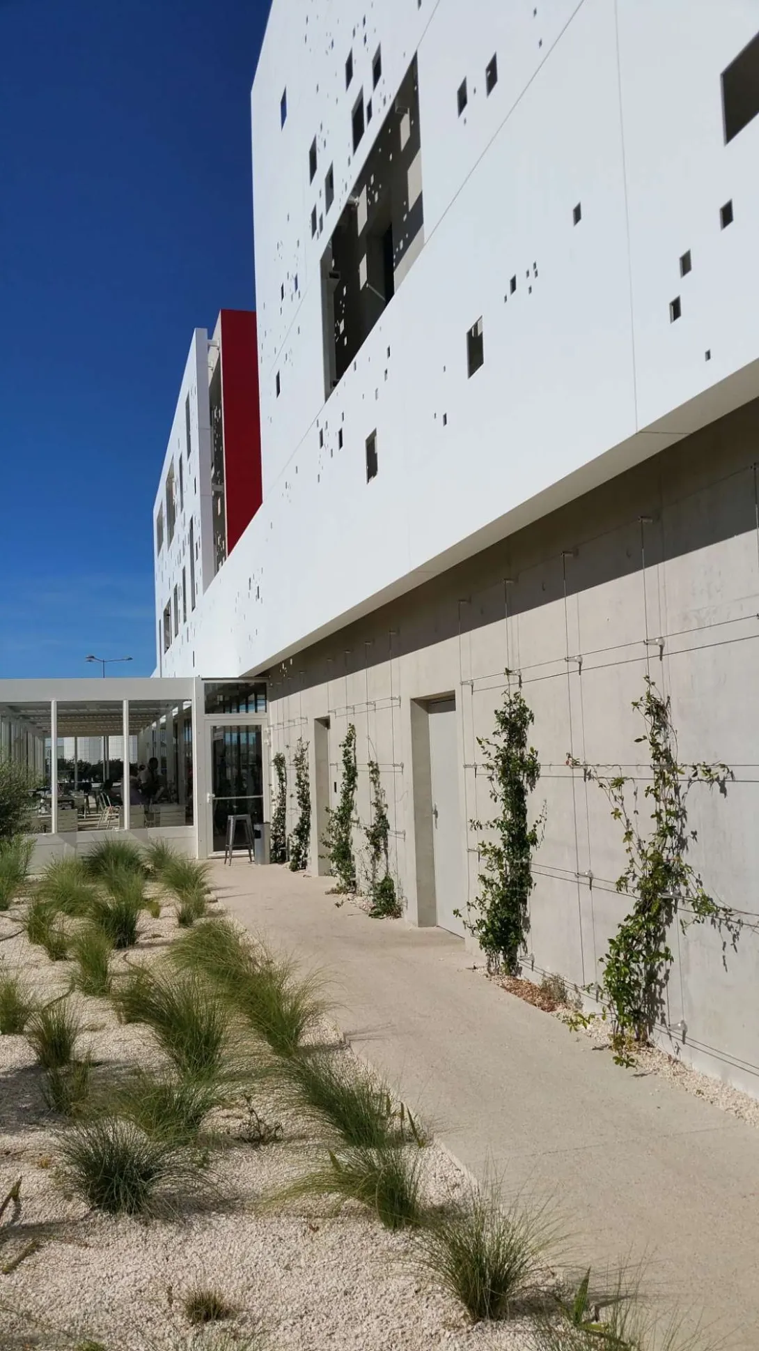 Le bâtiment est implanté sur un ancien parking délaissé, à proximité d’une voie à fort passage. Comme voulu, la très grande majorité des entreprises participant à ce projet étaient locales (50% sur Montpellier, 82% dans l’Hérault, 90% dans la région), et un certain nombre de matériaux aussi (bois Sud de France et pierre de Pompignan).