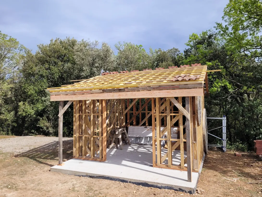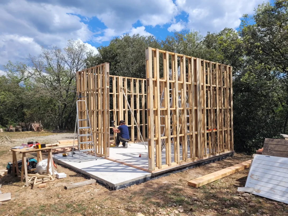 La structure a été posée sur une chape de ciment réalisée sur mesure par le maçon du client. L’ossature des murs et le toit sont réalisés avec des palettes de 4.20m/ 1.9m et les planches de contreventement sont issues de palettes démontées.