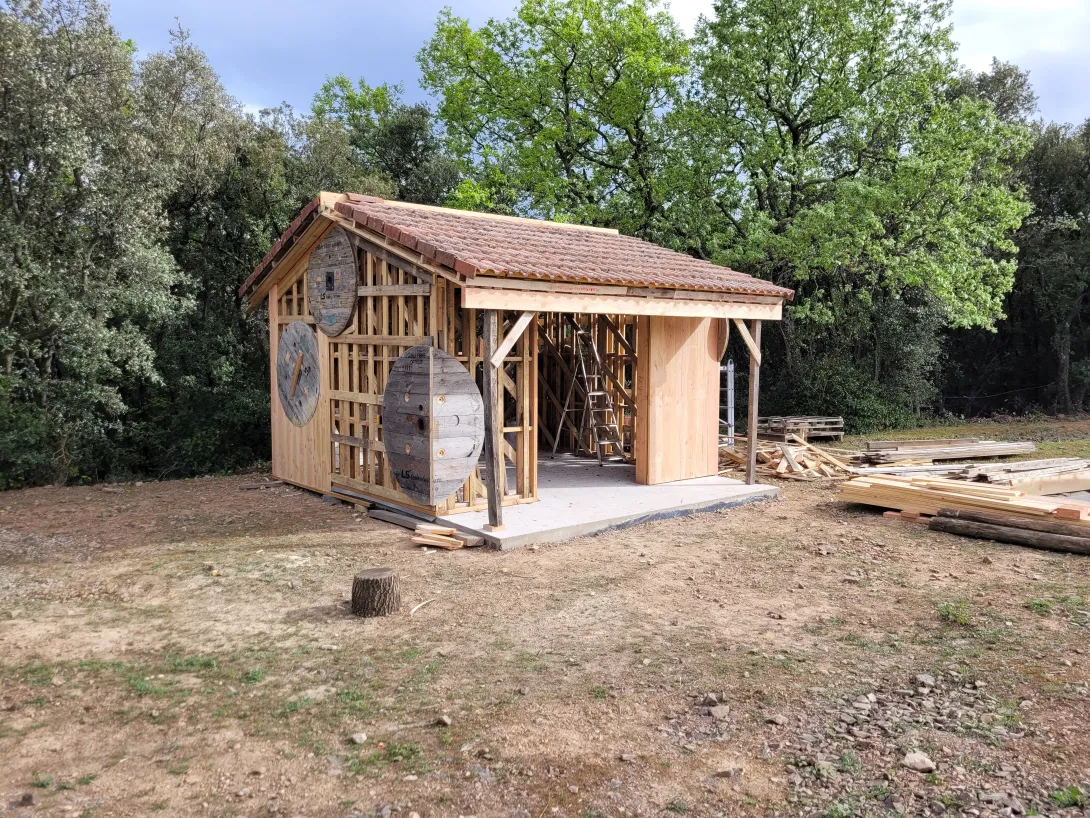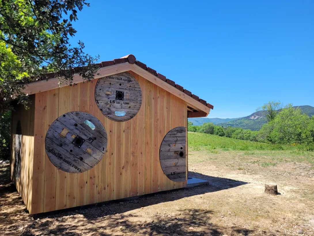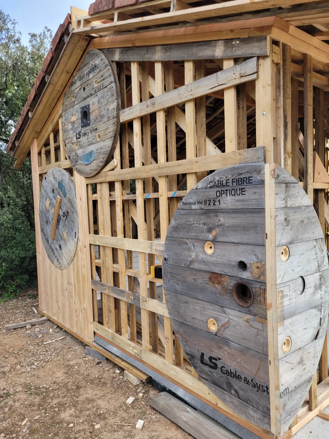 Dans le cas de ce cabanon ont été utilisé des palettes renforcées (collectées régulièrement pour l’un de leur client), ainsi que des plateaux ronds issus de tourets dont le gisement provient d’une entreprise installant la fibre sur le territoire lodévois.