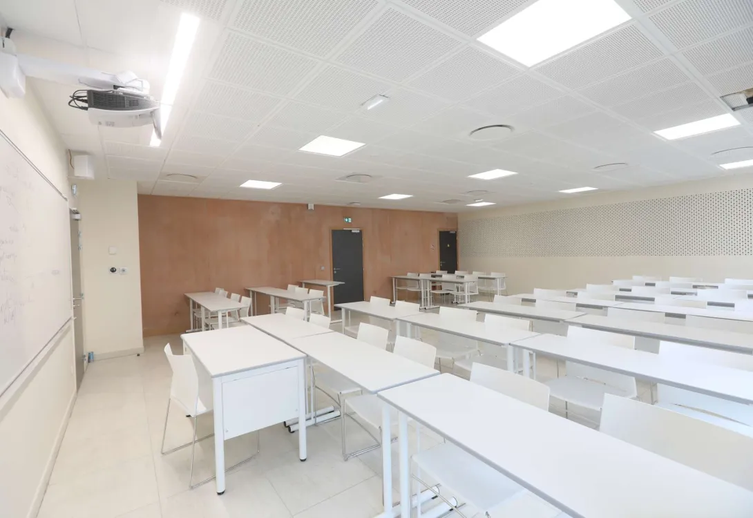 - Amphithéâtre : CTA (centrale de traitement d’air) double-flux thermodynamique couplée à un système VRV (Volume de Réfrigérant Variable) ; SCOP = 4,2 ; SEER = 6