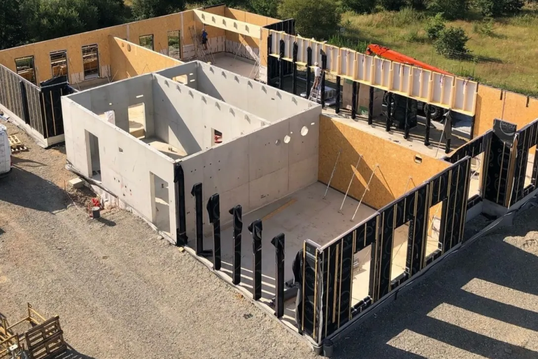 - Béton bâtiment Enseignement & Restauration : voile béton 20 cm ; isolation intérieure laine de bois 16 cm sous plaques de plâtre (R = 4,2 m².K/W)