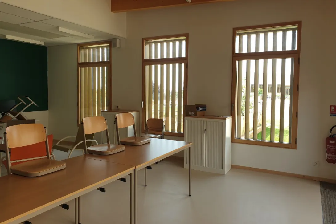 - Occultations : casquettes horizontales fixes au sud (lames bois orientées) et protections verticales à l’ouest (lames bois) pour le bâtiment Enseignement, brise-soleil orientables au sud et fixes à l’est et à l’ouest pour le bâtiment Restauration, brise-soleil fixes à l’est et à l’ouest pour le CDI