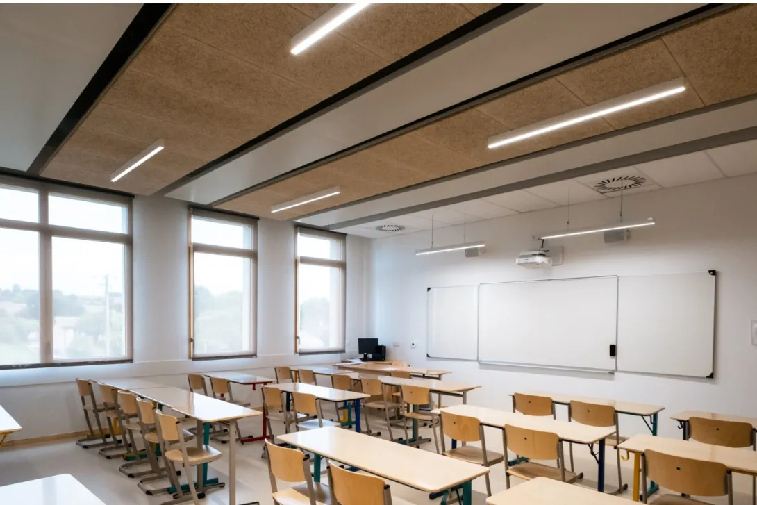 - Bois bâtiment Enseignement & CDI : murs ossature bois 14,5 cm ; isolation laine de bois 14 cm + 4 cm sous plaques de plâtre (R = 4,7 m².K/W)
