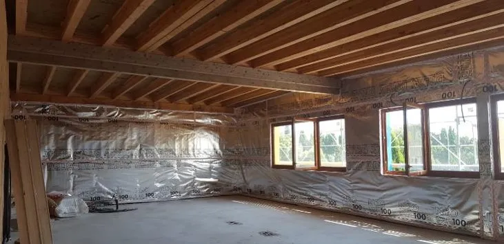 - Ossature bois 145mm - zinc sur double littelage - OSB 15 - laine de roche 145mm entre montant - pare-vapeur - correction acoustique thermique 80mm - écran thermique plaque plâtre 18mm (R = 6,7 m².K/W)