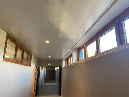 - sur préau : faux -plafond métal perforé - isolation thermique - prédalle béton - sol caoutchouc (R = 6,4 m².K/W)