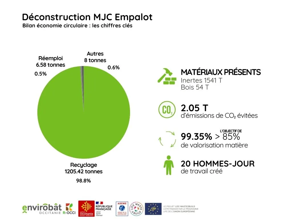 Ce projet intègre une démarche d’économie circulaire à travers le réemploi de ressources issues de la déconstruction. Il fait partie des chantiers expérimentaux de l’appel à projets Life Waste2Build.