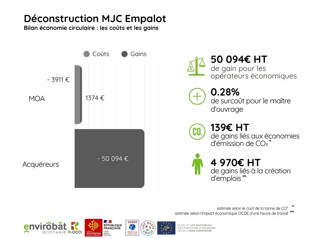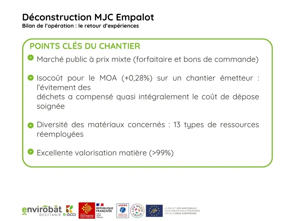 • un chantier à isocoût vertueux (+0.28%) : l’évitement des déchets a compensé quasi intégralement le cout de dépose soignée