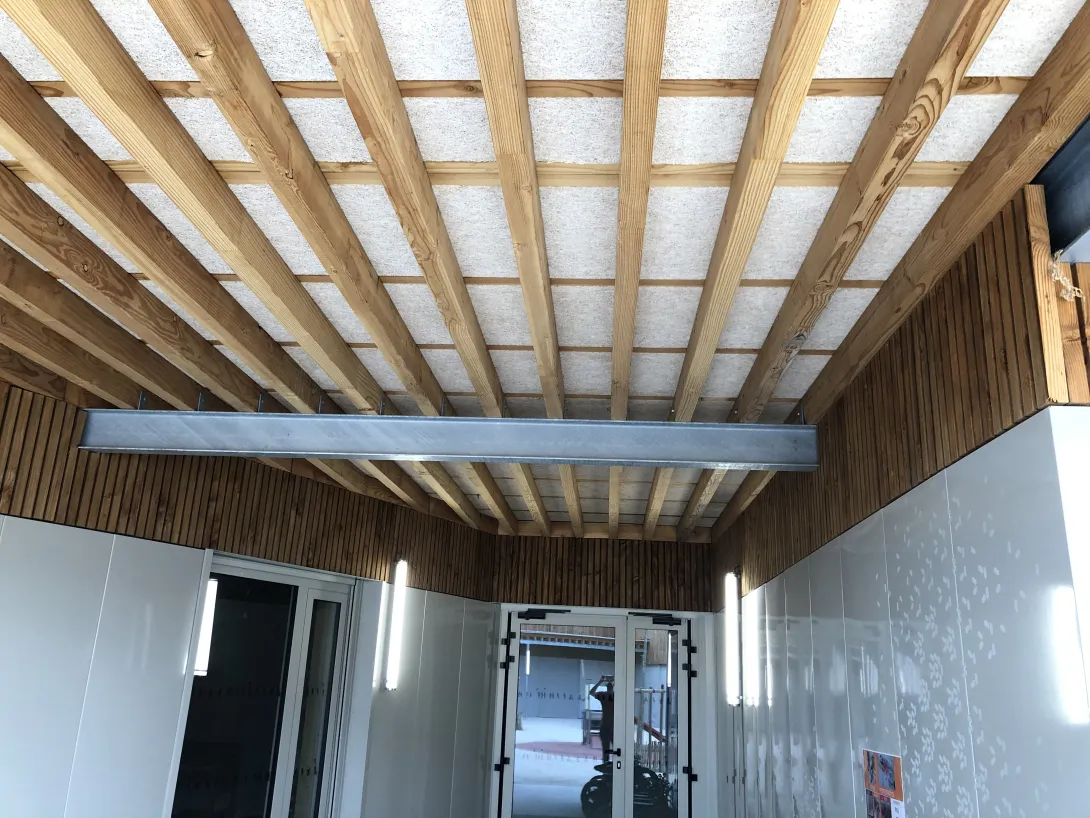 • Ossature bois et charpente bois pour la majorité du projet : façades ossature bois, bardage bois, cloisons bois, charpente et toiture bois