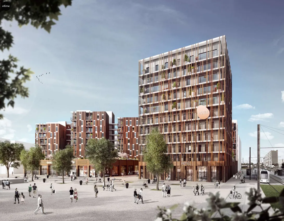 Réalisé en Conception-Réalisation, ce projet d’envergure en construction bois comprend 5 bâtiments de logements de 7 à 9 étages répartis en 2 îlots séparés par une venelle et positionnés sur un socle en béton accueillant les commerces et les locaux d’activités. Un 6e bâtiment de 10 étages accueille l’hôtel et des logements sur ses cinq derniers niveaux.