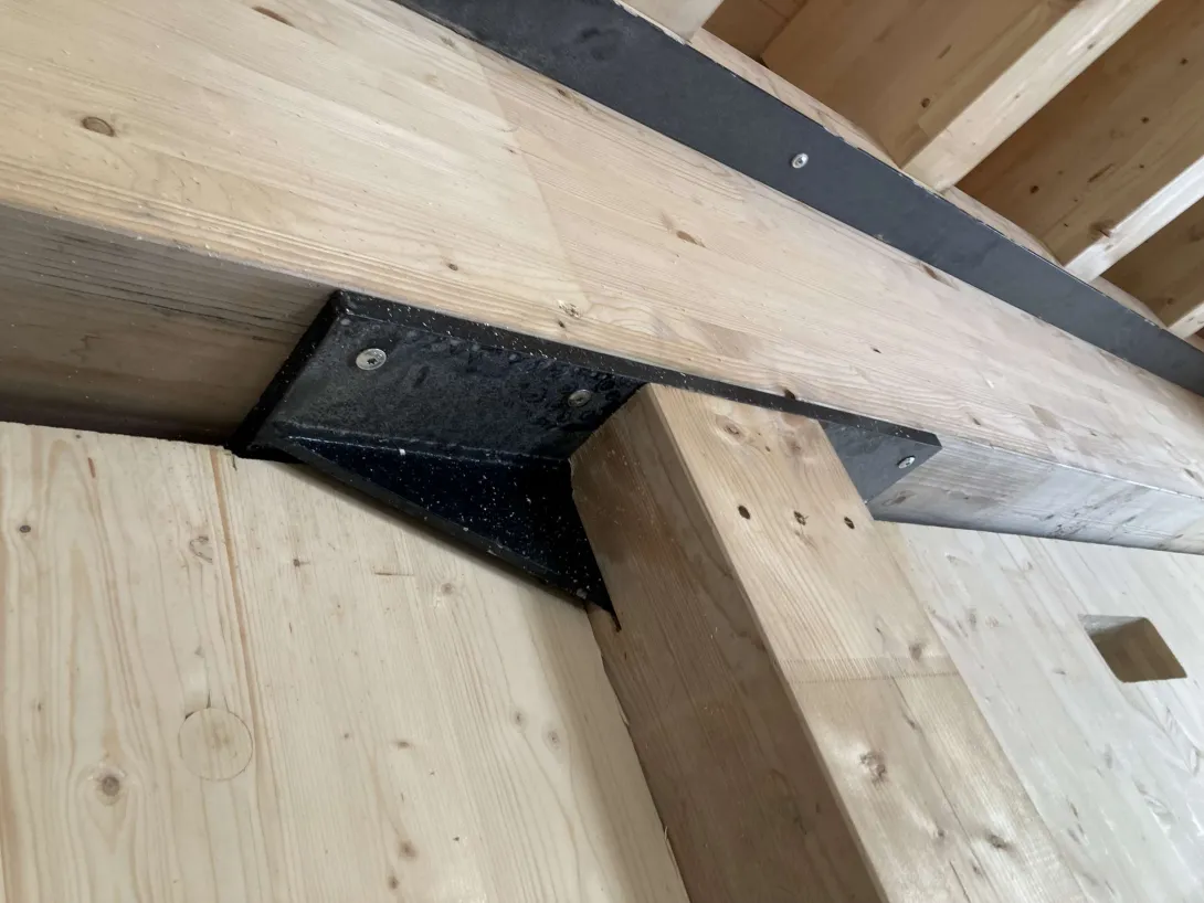 Tous les voiles bois recevront un traitement ignifuge pour satisfaire aux exigences de sécurité incendie. Les poutres en métal sont traitées par peinture intumescente (la couche noire qui est visible sur les photos est une couche de protection).