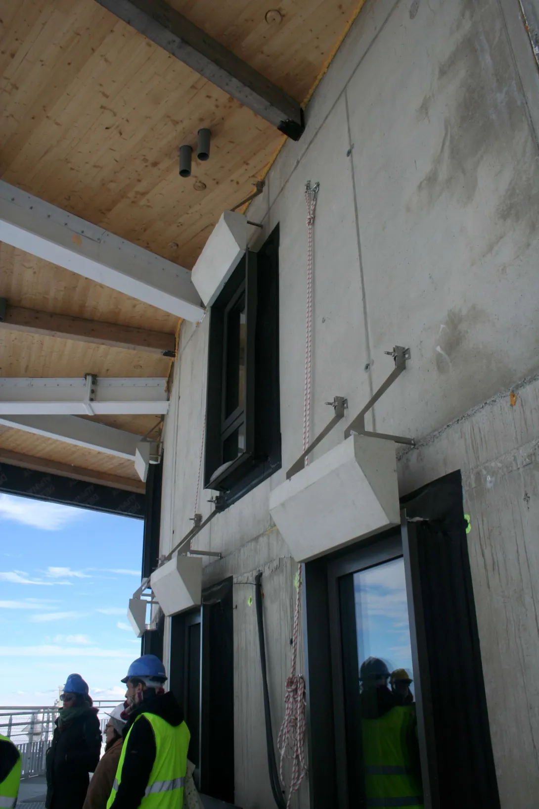 Ainsi, la préfabrication a été privilégiée : les façades sont arrivées finies (bardage compris) en dehors des zones de jonction entre éléments. Une grue était présente sur site pour la mise en oeuvre.