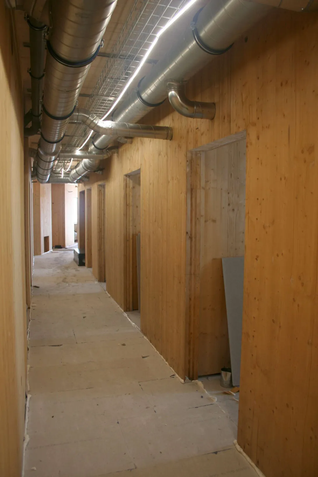 Les chambres sont conçues pour pouvoir être facilement transformées en salles de travail : une cloison sur deux est démontable. Les cloisons sont doublées en panneaux 3 plis lorsque l’acoustique le nécessite.