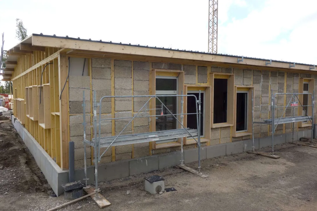• celle des blocs de chaux-chanvre préfabriqués, maçonnés en remplissage des demi caissons en ossatures bois (également préfabriqués et fermés côté intérieur) à la façon d’un remplissage de colombage