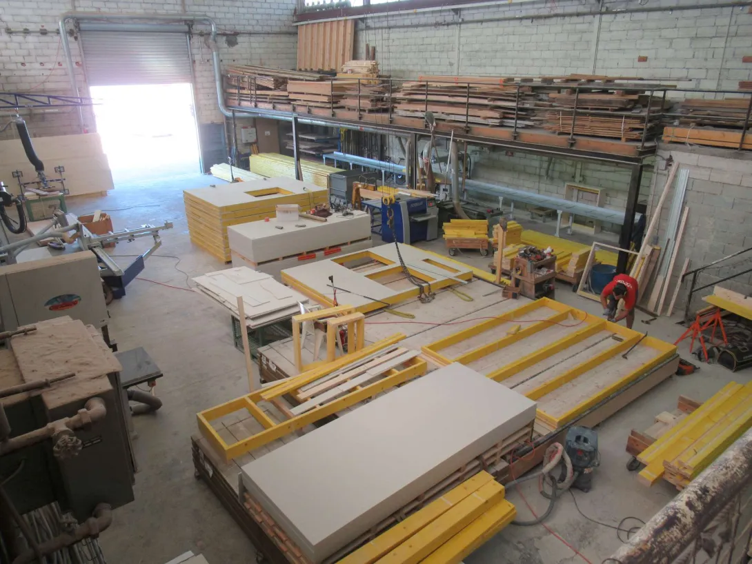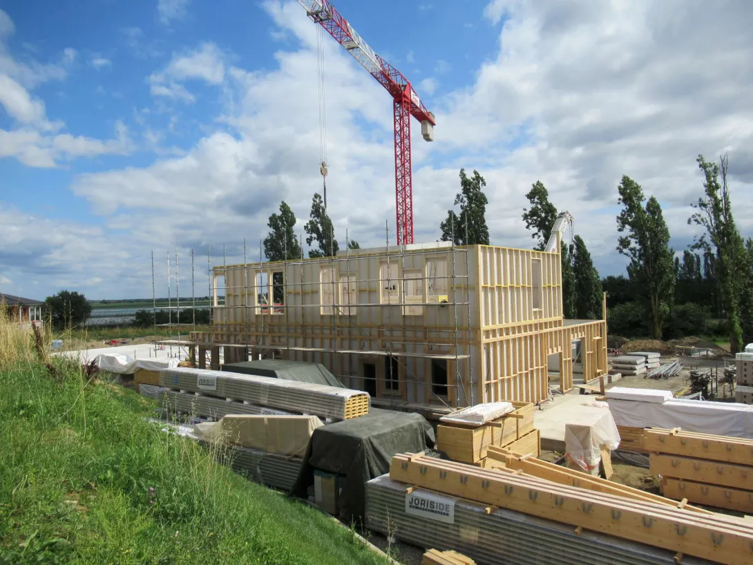 • panneaux préfabriqués en ossature bois de 14,5 cm de large, fermés par l’intérieur par des plaques de gypse-cellulose (voile travaillant + finition intérieure)
