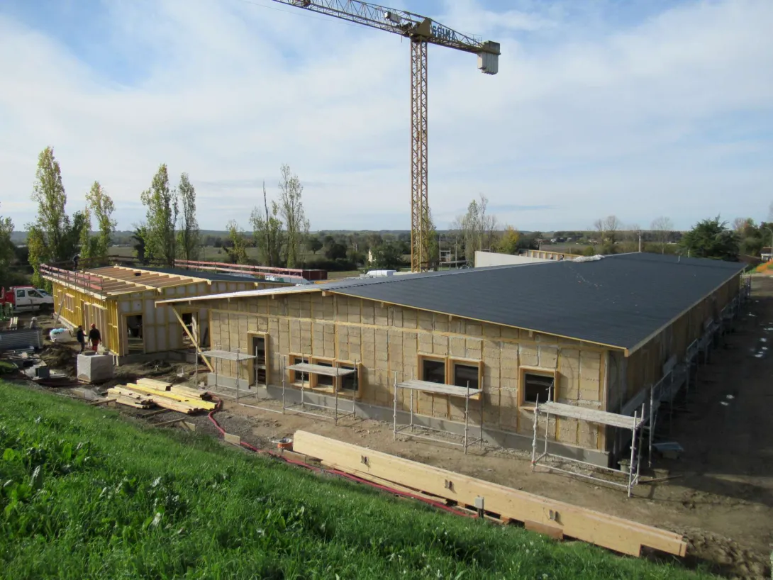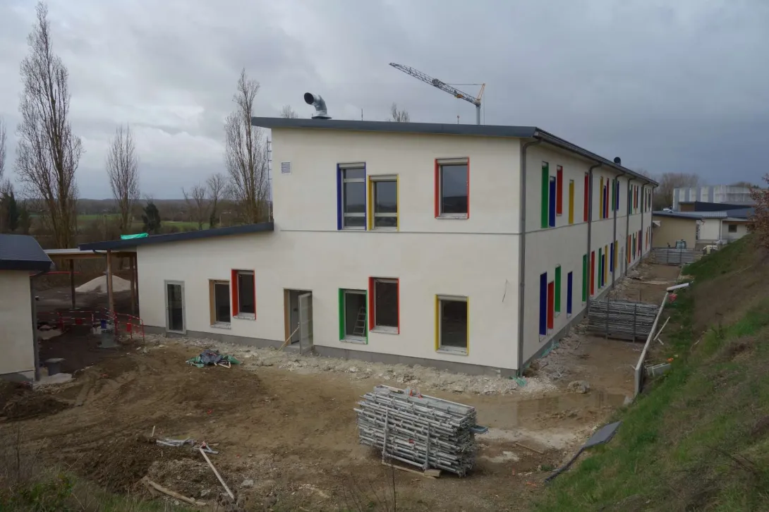 La construction des deux entités, école maternelle d’abord puis école élémentaire dans un second temps, a été réalisée à partir de murs à ossature bois et de béton de chanvre suivant un procédé en grande partie préfabriqué. Le chantier de l’école maternelle, de plain-pied, n’a ainsi duré que 5 mois.