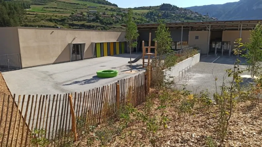 Le choix précis de l’orientation de la totalité des classes maternelles et élémentaires, ainsi que du restaurant, permet de cadrer les vues sur le grand paysage. Le bâtiment est implanté de façon à protéger les cours de récréation du vent du nord et du bruit de la route départementale. Il s’intègre au site grâce à un développement à l’horizontal, à des toitures végétalisées vierges de tout équipement technique et à des préaux photovoltaïques semi-transparents.