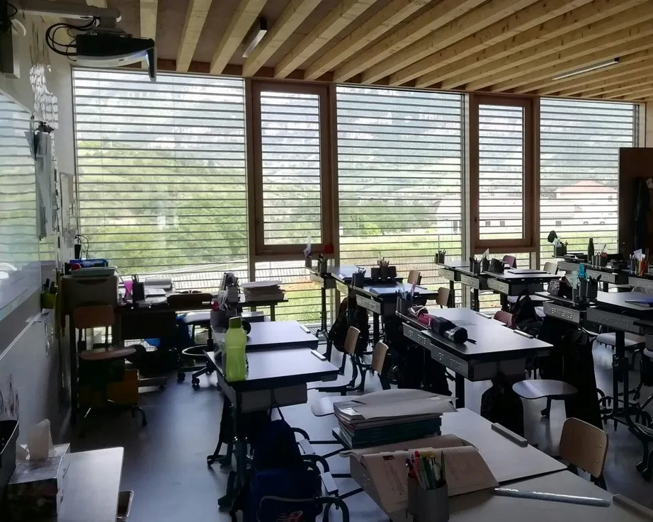 - commande manuelle et arrêt par détection d’absence dans les salles de classes avec gradation en fonction de la luminosité naturelle