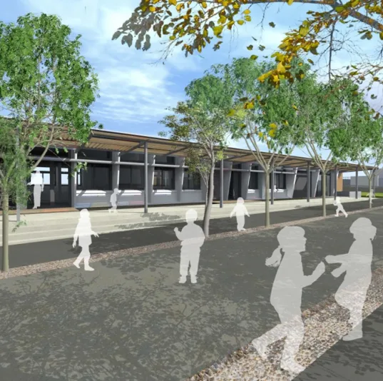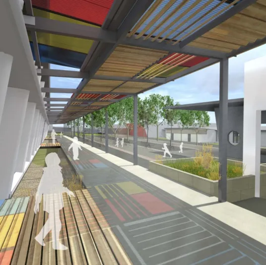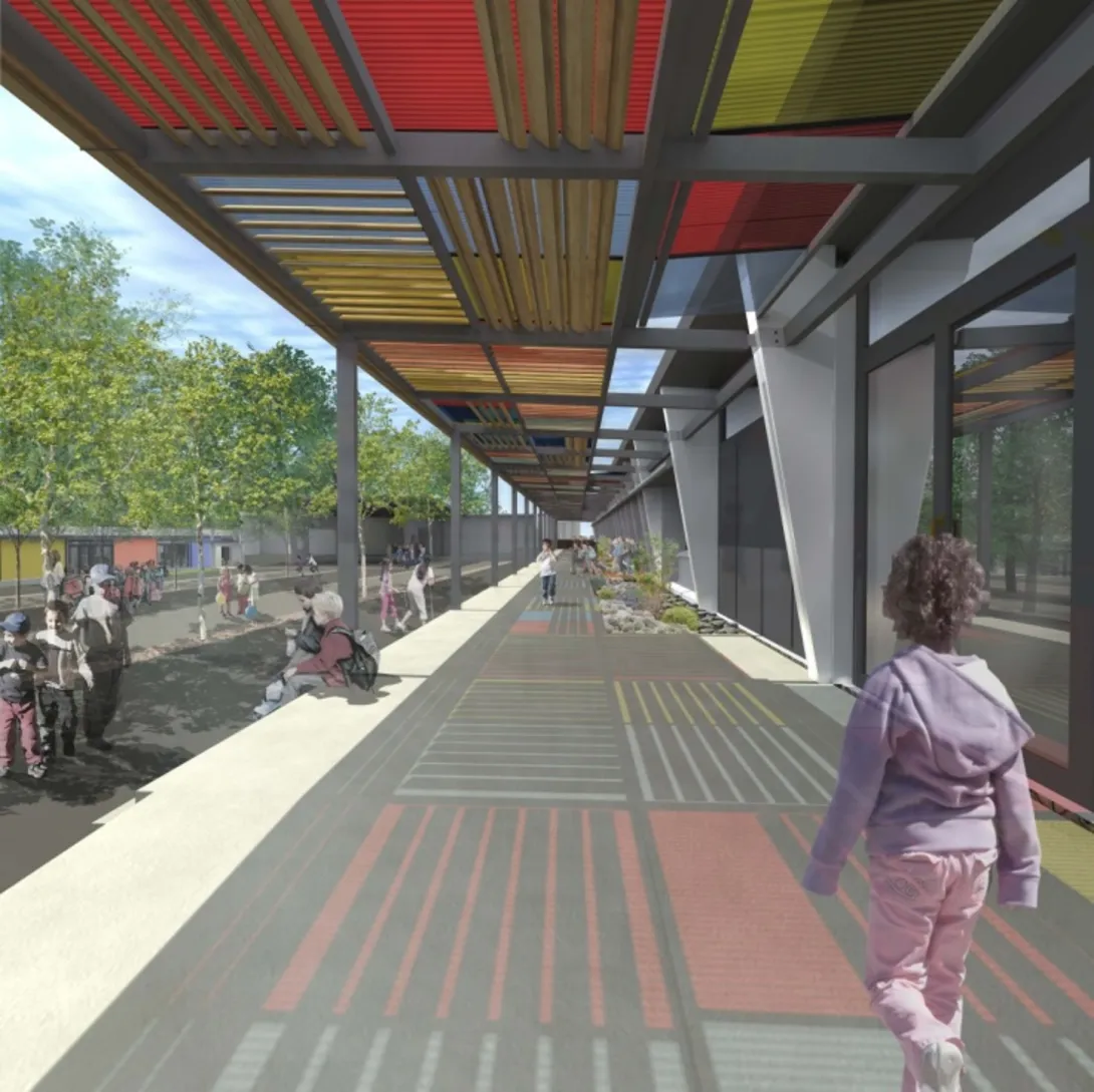 En termes de matériaux, il a été prévu en conception de valoriser la conservation de l’inertie du sol existant sur terre-plein. Pour ce qui est des défis de confort et santé, la coursive prévu apporte de nombreux avantages, comme un confort estival, un agrandissement des salles de classes et un éclairage et une ventilation naturelle traversante avec les ouvertures Nord. Il avait aussi été prévu de réaliser un revêtement en enrobé drainant avec mise en place d’une tranchée d’infiltration, pour une partie des cours.