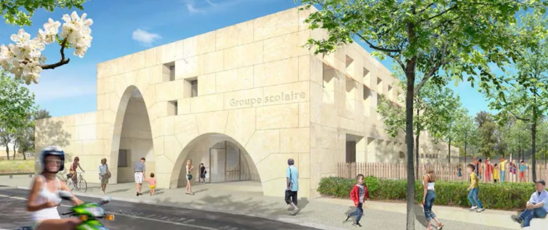 C’est l’impulsion de la création d’un nouveau quartier et pôle d’attractivité de la commune, autour de différents équipements publics, qui lance donc la réhabilitation d’un site industriel avec démolition et désamiantage des hangars existants d’anciens ateliers d’exploitation de la Carrière Romaine en groupe scolaire.