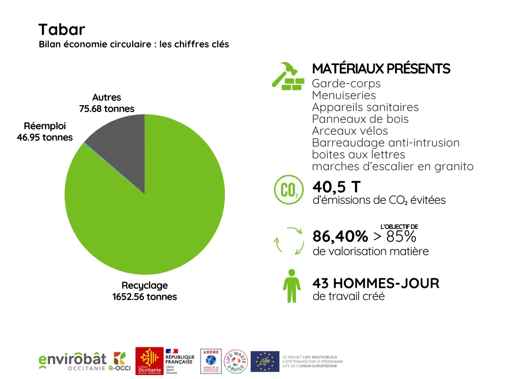Ce projet intègre une démarche d’économie circulaire à travers le réemploi de ressources issues de la déconstruction. Il fait partie des chantiers expérimentaux de l’appel à projets Life Waste2Build.