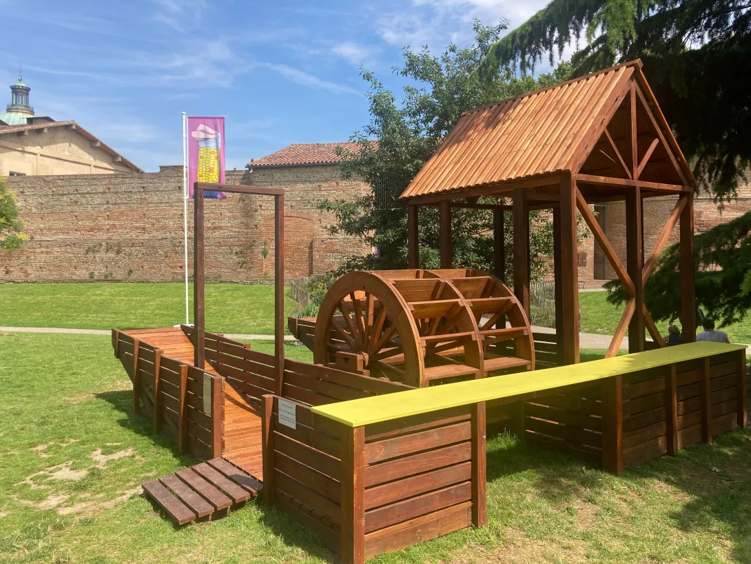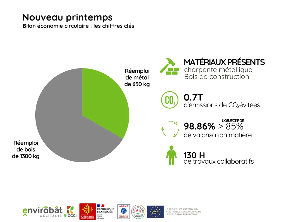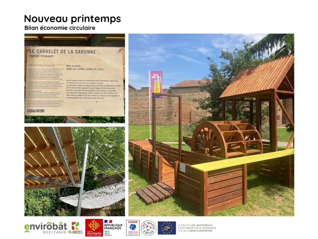 - 1300 kg de bois issu du chantier de déconstruction du gymnase Daste et de la déconstruction de l’exposition des Jacobins réemployé sur l’œuvre du « Moulin à Nef » par l’association 3,14 conception en partenariat avec les étudiants en menuiserie du lycée Urbain Vitry (fabrication de la roue).