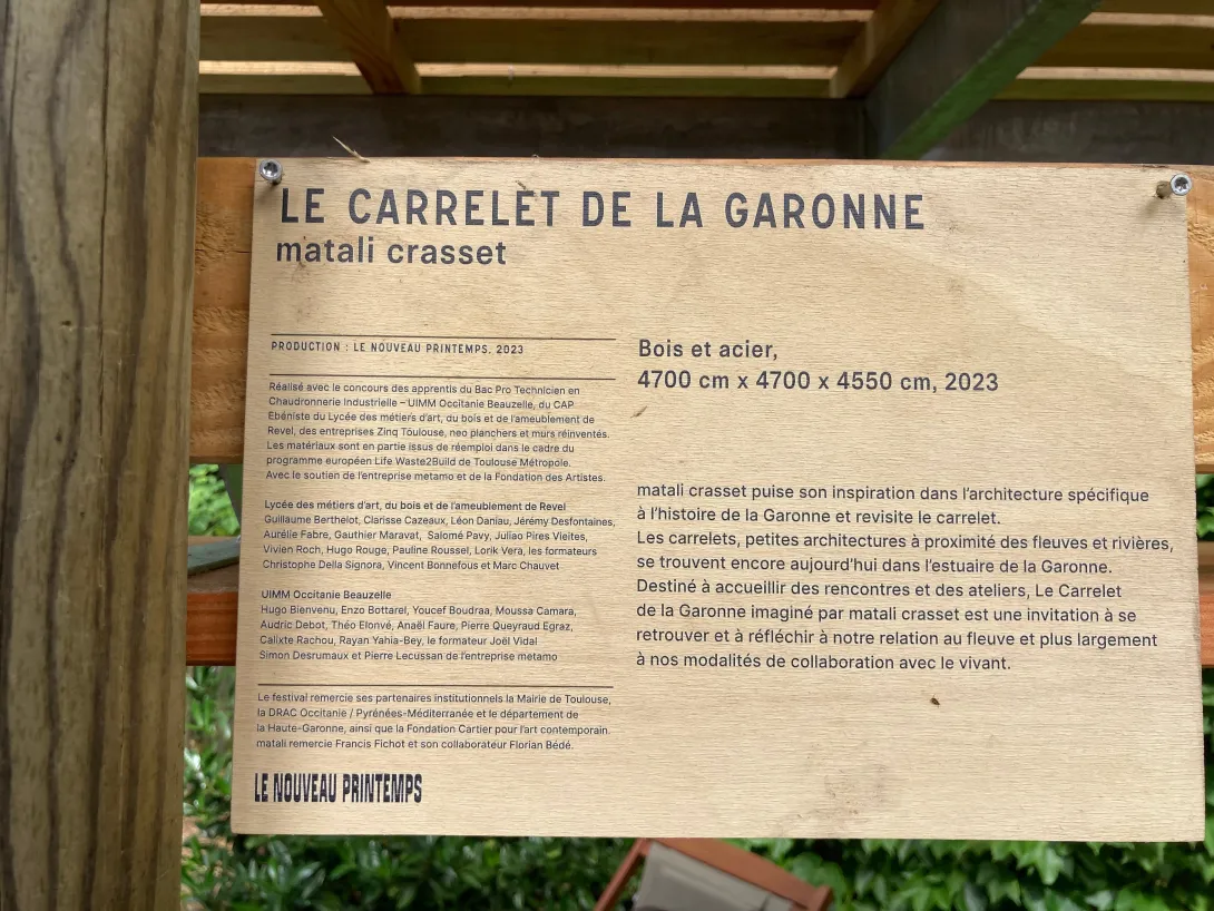 - 650 kg de métal issue de la charpente métallique du chantier de déconstruction du gymnase Daste réemployé sur l’œuvre du « Carrelet » par Metamo en collaboration avec le pôle formation UIMM de Beauzelle (partie métal) et le lycée des métiers d’art de Revel (partie bois).