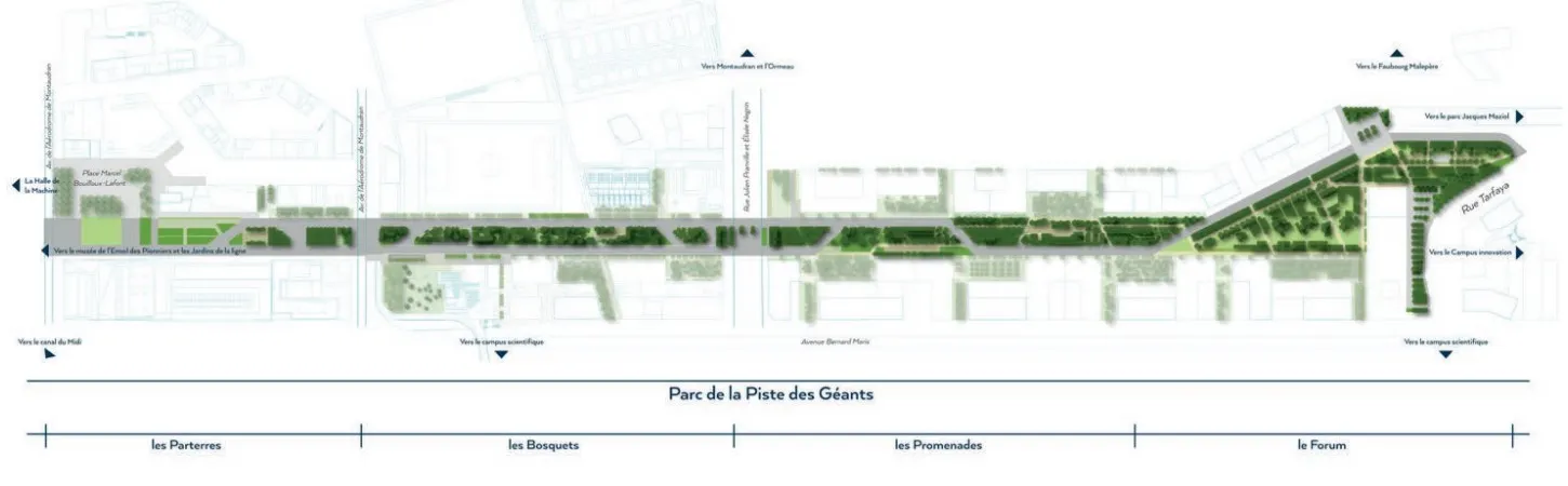 l’écoquartier Toulouse Aerospace. Il s’étend sur 1,2 km de long, séquencés en 4 espaces distincts : les parterres, les bosquets, les promenades et le forum.