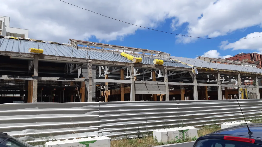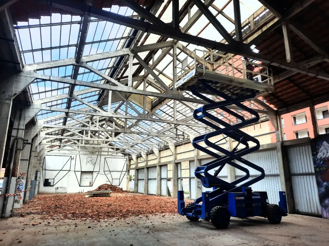 L’élément principal conservé est la structure béton du bâtiment. Les portiques béton sont nettoyés à haute pression et réparés. Une logique de réemploi a également été déployée sur le projet, puisque les anciennes tuiles du bâtiment seront réutilisées dans la travée verte – partie du bâtiment qui sera plus ouverte et végétalisée. Certaines d’entre elles seront réutilisées intactes pour fabriquer des bancs et d’autres concassées pour servir de substrat pour les fosses des arbres qui seront plantés. Des portiques métalliques et des tôles de façades ont également été conservés et transportés dans l’espace des 500.