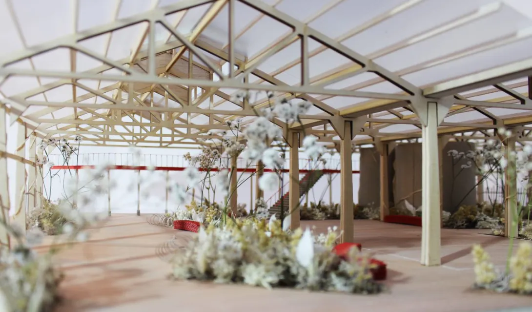 - Charpente et couverture : arbalétrier existant en béton reprenant la trame des 5 m. Création de outeaux en bois (sorte de réhausses en toiture pour la lumière et la ventilation naturelle) sur toute la travée centrale et couverture en polycarbonate transparent.