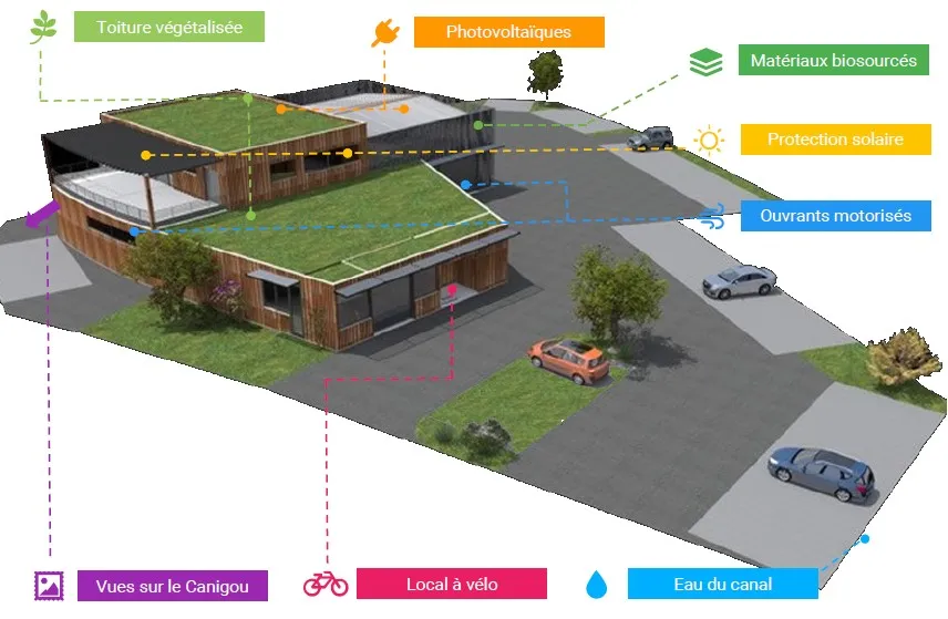 - Panneaux photovoltaïques : 33.6 kWc (196 m²). Autoconsommation visée.
