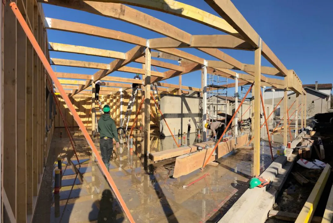 Le bois, utilisé en système porteur, en tableaux de menuiseries, en aménagement intérieur, devait être local et sans traitement ni colle pour avoir la meilleure qualité d’air ambiant possible. Les essences ont été sélectionnées avec l’aide du Parc Naturel Régional des Pyrénées Ariègeoises. Un lot dédié a été créé pour maîtriser sa provenance. L’entreprise titulaire du lot en question a assuré la fourniture des grumes, le sciage, le séchage, le rabotage, le stockage et l’amenée des pièces de bois sur chantier.