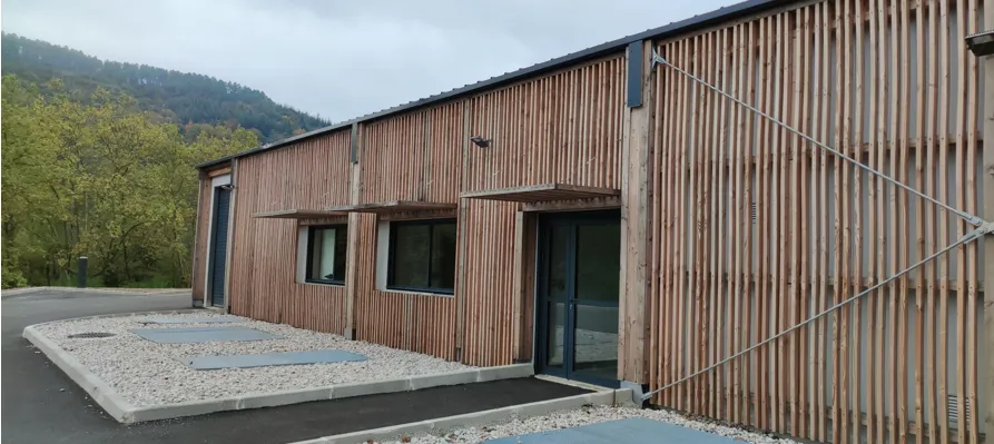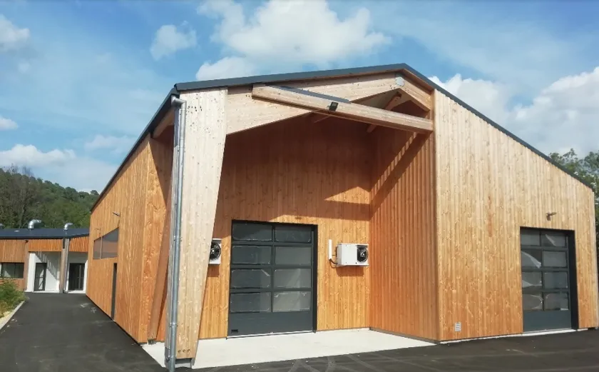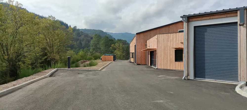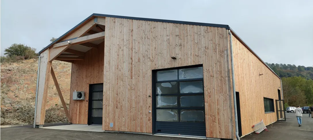 - Ateliers : charpente bois lamellé-collé et bois massif ; panneaux sandwich acier laqué isolation polyuréthane 10 cm (R = 3,5 m².K/W)