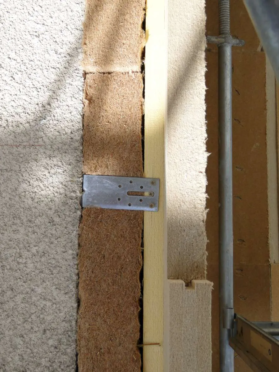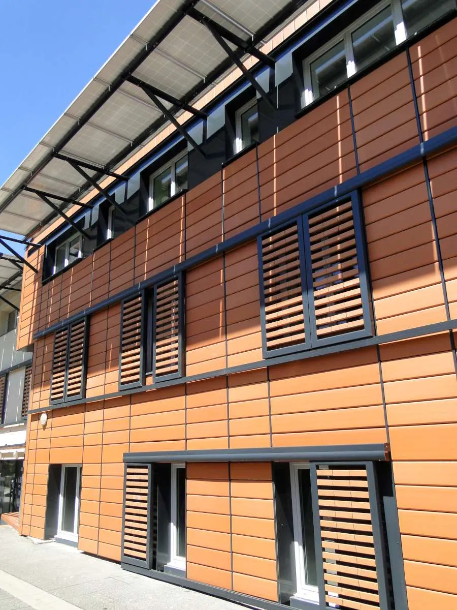 • Murs/ enveloppe, plancher, cloisons : Panneaux de laine de bois (laines souple et compressée dure), bardage en terre cuite, système de brise-soleil, isolation thermique par l’extérieur grâce aux panneaux de laine de bois 200 mm agglomérée à la cellulose, pied de façade traité en liège