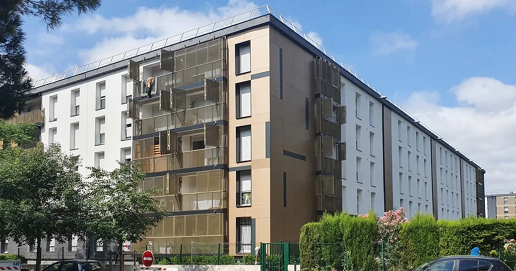 La restructuration et la réhabilitation énergétique (BBC-rénovation), technique et architecturale des 161 logements existants ont permis la construction de 12 logements neufs dans les volumes existants. Le bâti existant a été conservé et réutilisé au maximum (structure / toiture…) avec comme objectif prioritaire la réduction de l’impact environnemental du bâtiment et de ses coûts en fonctionnement (consommation électrique, efficacité énergétique des équipements remplacés).