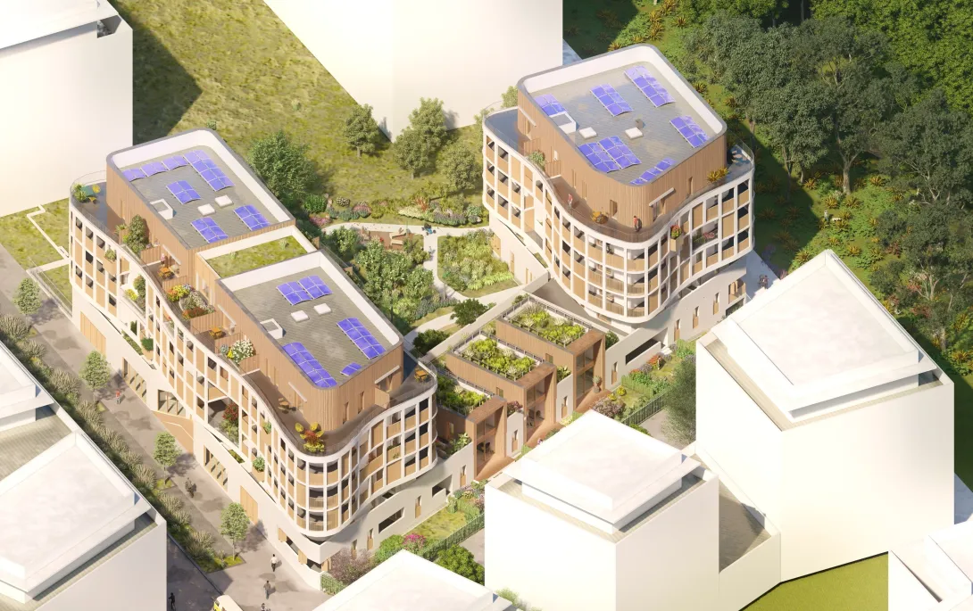 - Usages : 56 appartements et 3 maisons, jardin paysager, verger partagé et terrain de pétanque