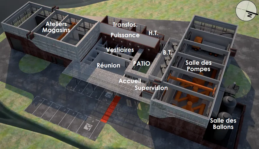 - Usages : Locaux industriels (salle de pompes, salle des ballons, B.T., transformateurs, ateliers...), tertiaires (magasins, vestiaires, salle de réunion...), et un patio