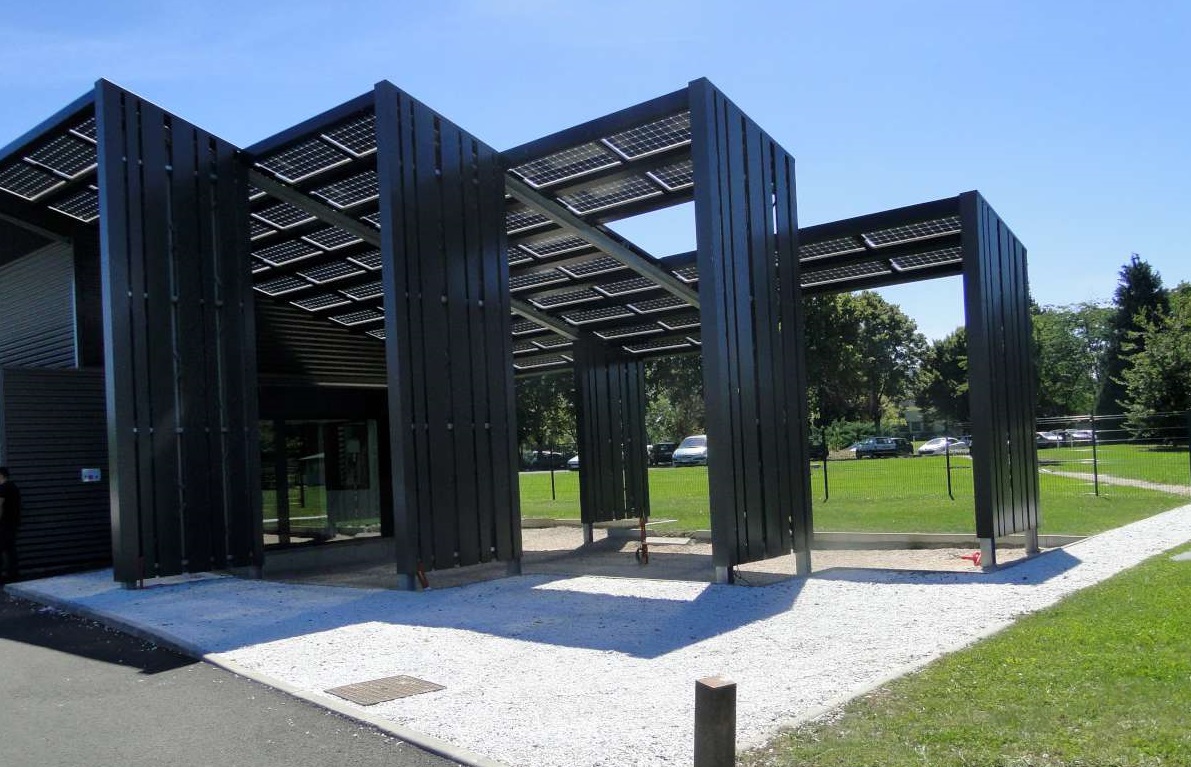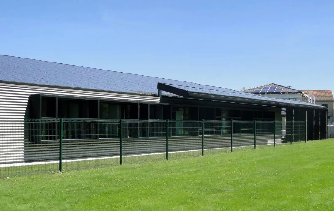 La toiture est à un seul pan, orientée sud, avec des débords de chaque côté afin d’avoir davantage de surface photovoltaïque que de surface de sol. L’ensemble de la toiture et une casquette solaire côté sud reçoivent des panneaux photovoltaïques : panneaux plaques classiques pour la majeure partie, et panneaux translucides (qui permettent une production par rayonnement direct et indirect - par au-dessus et en-dessous) pour le préau de l’entrée.