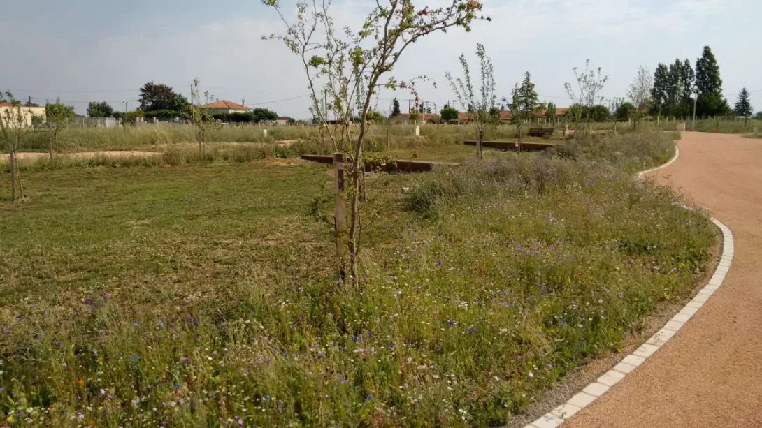 Le quartier fait la part belle à la végétalisation : arbres fruitiers (destinés à être partagés en bonne entente par les habitants) et prairies fleuries pour les espaces publics, haies déjà plantées et clôtures déjà réalisées entre les parcelles.